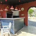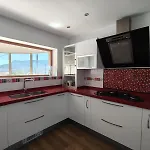 На этой вилле, откуда открывается вид на сад, также есть кухня.